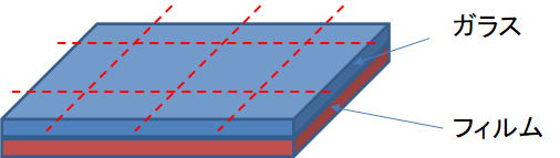 PETフィルムが貼り合わせられることでの割れた際の飛散防止の用途や機能性が付与されたフィルムが貼り合わせられたガラス基板をジャストサイズで分断することが可能です。